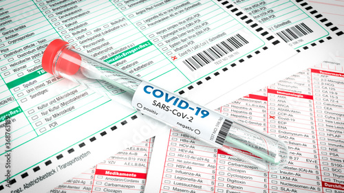 © MACLEG, Obraz premium Covid-19 Abstrich-Teströhrchen auf medizinischen Testformularen