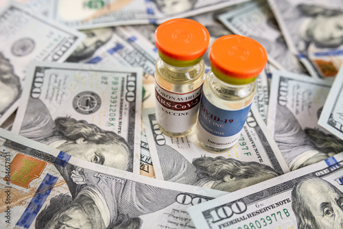 Fototapeta premium COVID-19 or other vaccine in bottle on dollar bills background