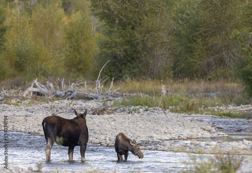 Fototapeta premium Cow and Calf Moose in a River in Wyoming in Autumn