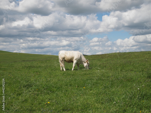 © BjörnBuxbaum-Conradi, Fototapeta premium cow (Bos taurus) grazing on pasture, Dörnberg near Kassel, Hesse, Germany