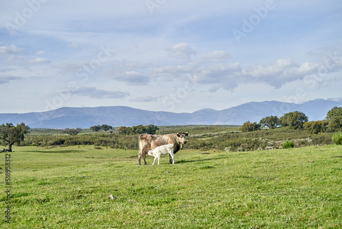 © Nedrofly, Obraz premium Cow Feed Milk To Calf At Outdoor