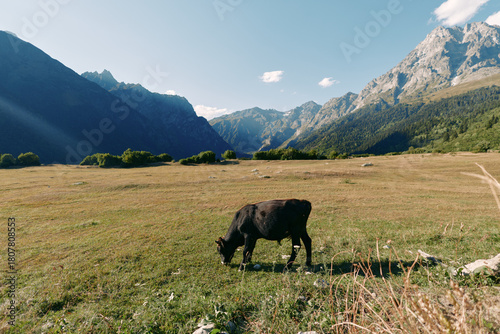 © SHOTPRIME STUDIO, Fototapeta premium Cow grazing in a wide meadow with mountains and a valley in the background, alpine pasture and green grass under clear blue sky, rural landscape and peaceful nature.
