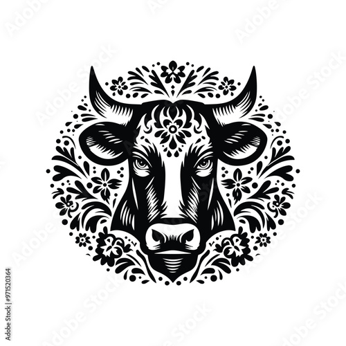© Cici, Obraz premium Cow in folk art black and white silhouette illustration