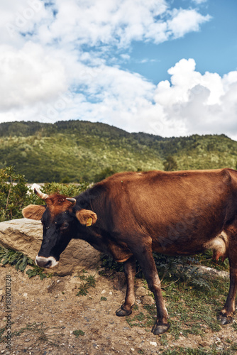 Naklejka premium cow rural landscape pasture mountain sky grazing animal near dirt path with...