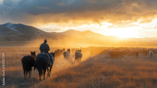 © wannathon, Naklejka premium Cowboy Herd Sunset.