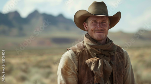 © Birgit Reitz-Hofmann, Fototapeta premium Cowboy smiling and wearing a hat looking at Camera