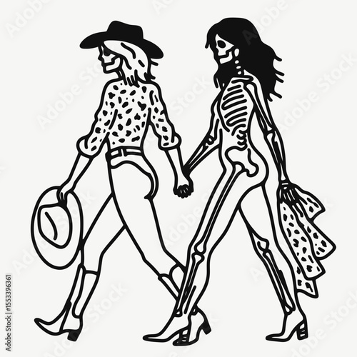 © Aofintarapak, Fototapeta premium Cowgirl Female skeleton with leopard print Walking together. Cowboy Western American Cartoon Animal Clipart Line Art Vector Illustration. .