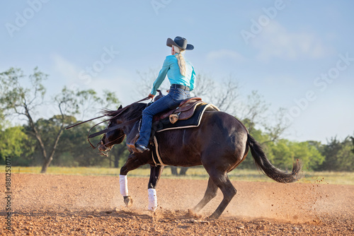 © Terri Cage , Fototapeta premium Cowgirl riding reining horse western