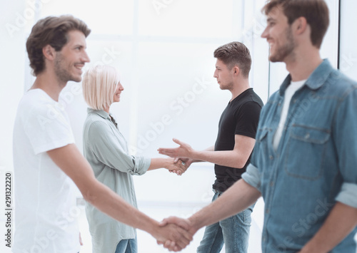 Fototapeta premium coworkers shaking hands in the office lobby.