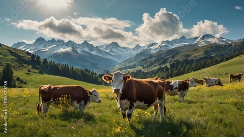Obraz premium Cows graze in a lush alpine meadow with majestic snow-capped mountains in the...