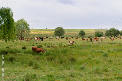 © Bilal, Obraz premium Cows graze in a meadow in a field. Picture from the far. Pasture and green grass. Panoramic shot. Farming and agricultural concept. Pinarbasi district, Emirdag, Afyonkarahisar, Turkey