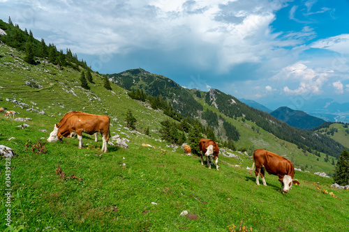 © Bernadett, Obraz premium Cows grazing in tyrol alm Austria on the mountains milk cheese advertisement