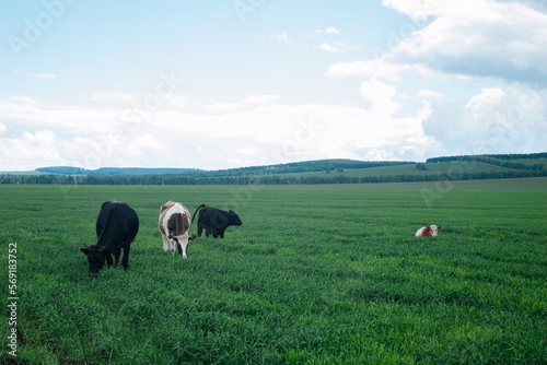 © epovdima, Fototapeta premium Cows grazing on a green summer meadow