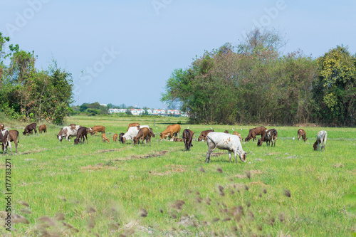 © akkalak, Obraz premium Cows grazing on farm with green field in good weather day