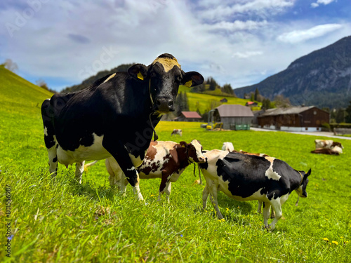 Fototapeta premium Cows grazing, Rougemont, VD