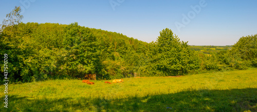 Obraz premium Cows in a green hilly meadow under a blue sky in sunlight in springtime, Voeren, Limburg, Belgium, June, 2021