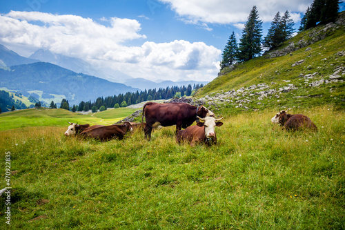 Obraz premium Cows in a mountain field. The Grand-Bornand, France
