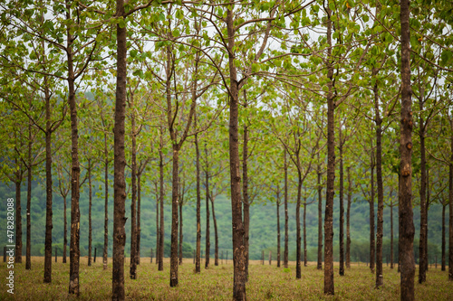 © Buonaventura, Naklejka premium Cows in a rural paddock on straw with eucalyptus inside a farm in Brazil.