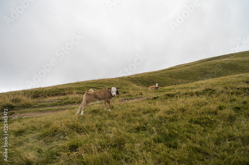 © czamfir, Naklejka premium cows on a mountain meadow in a rainy day