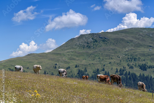 © dinkaspell, Obraz premium Cows on alpine pasture, Millstatter Alpe, Millstatt am See, Carinthia, Austria