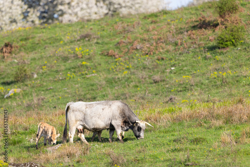 Fototapeta premium Cows on pasture in spring landscape, Slovakia