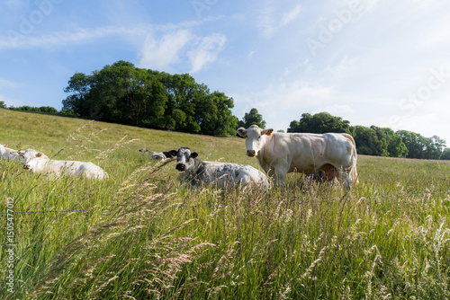 © Antoine, Fototapeta premium Cows Resting in a Summer Meadow Under a Blue Sky