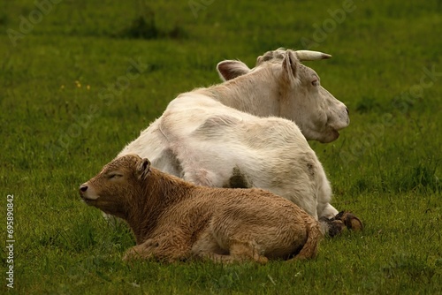 Fototapeta premium cows with calves resting on a meadow in summer