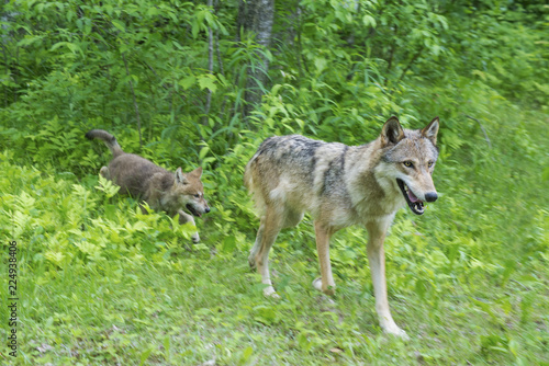 © bettys4240, Fototapeta premium Coyote adult and wolf pups playing together.