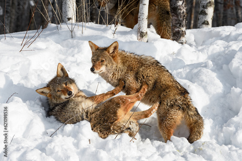 Naklejka premium Coyote (Canis latrans) Pushes Away Packmate With All Four Paws Winter