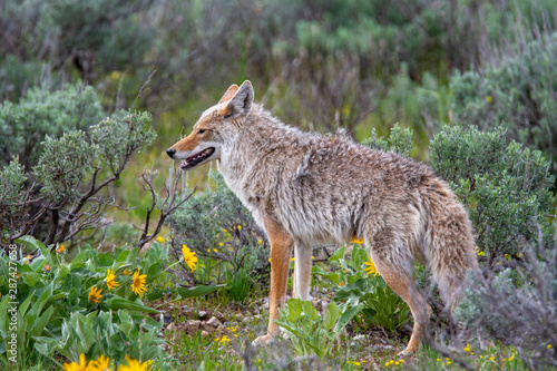 Fototapeta premium Coyote hunting in Grand Teton National Park