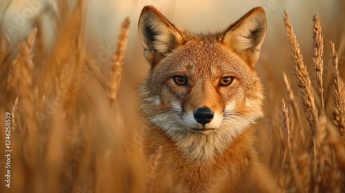Fototapeta premium Coyote in tall grass at sunset, wildlife scene