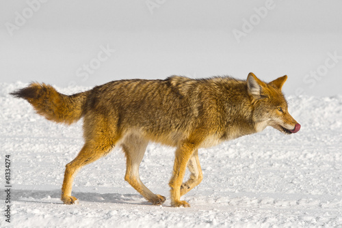 Naklejka premium Coyote licks its own nose while running
