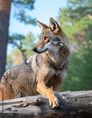 © Gam, Fototapeta premium Coyote perched on log in serene forest setting