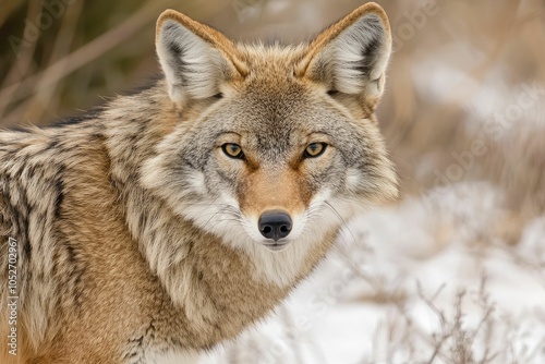 Naklejka premium Coyote stalking captured in vivid portrait photography, striking hues and...