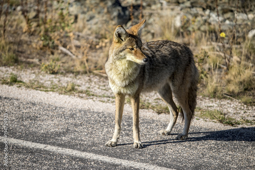 Fototapeta premium Coyote walking near a road in Northern Utah