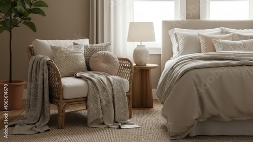 Fototapeta premium Cozy and Elegant Bedroom with Natural Textures and Soft Tones in Contemporary...