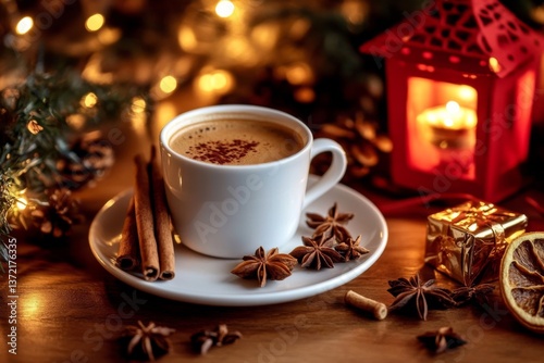 Obraz premium Cozy and Festive Coffee Table Setting with Cinnamon Sticks, Lantern, and...
