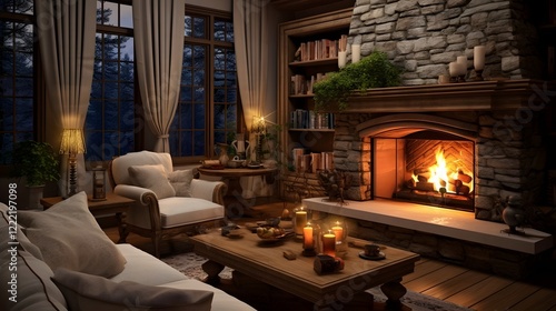 Fototapeta premium Cozy and Inviting Living Room with Fireplace and Comfortable Furnishings in a...