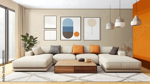 © Boss Architectura , Fototapeta premium Cozy and Inviting Modern Living Room with a Large Comfortable Sectional Sofa Minimalist Stylish Decor Accent Pieces