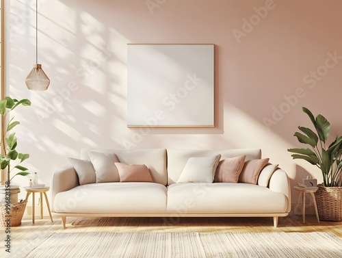 © Boss Architectura , Fototapeta premium Cozy and Stylish Contemporary Living Area with Generously Sized Sofa and Warm Natural Light Scandinavian Inspired Interior Design with Clean Lined Furnishings Detailed Textures and Serene Ambiance