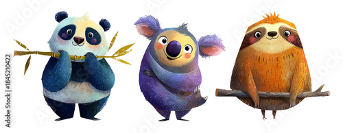 © Malika, Naklejka premium Cozy Animal Illustration in Warm Style Featuring Adorable Panda, Koala, and Sloth