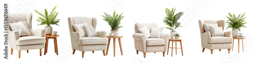 Fototapeta premium Cozy Armchair Scene: Four Views with Ferns, Side Tables, and Cushions