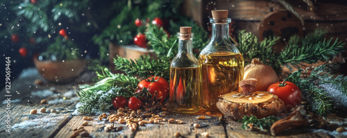 Fototapeta premium cozy arrangement of vegetable oils in glass bottles surrounded by fresh ingredients like tomatoes, onions, and herbs, evoking warm, festive atmosphere