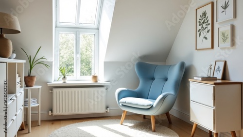 Fototapeta premium Cozy Attic Interior with Blue Armchair and Natural Light from a Large Window