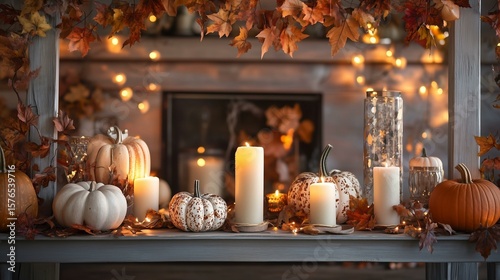 © Lastwizard Shop, Fototapeta premium Cozy autumn decor with candles and pumpkins.