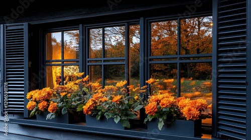 © Creative_art, Fototapeta premium Cozy Autumn Evening Reflected in Window with Vibrant Marigolds