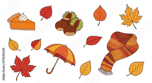 © Chana, Obraz premium Cozy Autumn Harvest Vector Graphics Collection Pumpkin Pie Scarf Umbrella Falling Leaves