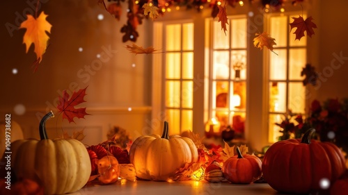 Fototapeta premium Cozy Autumn Kitchen with Pumpkins and Fall Decor on Table
