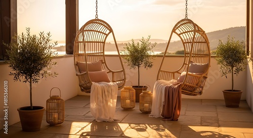 Obraz premium Cozy Balcony Seating with Hanging Chairs and Lanterns at Sunset