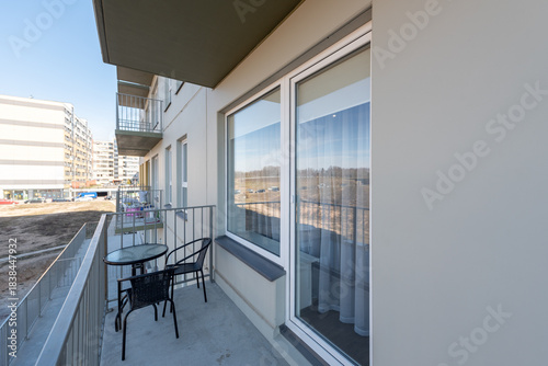 © Mindaugas Dulinskas, Fototapeta premium Cozy Balcony With Outdoor Seating in a Modern Residential Area